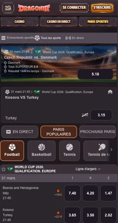Vous pouvez choisir de participer avec le bookmaker Dragonia via les paris traditionnels avant match ou les modes de paris en direct dynamiques, qui proposent tous deux des cotes compétitives par rapport à la moyenne du marché. Jugez-en par vous-même !